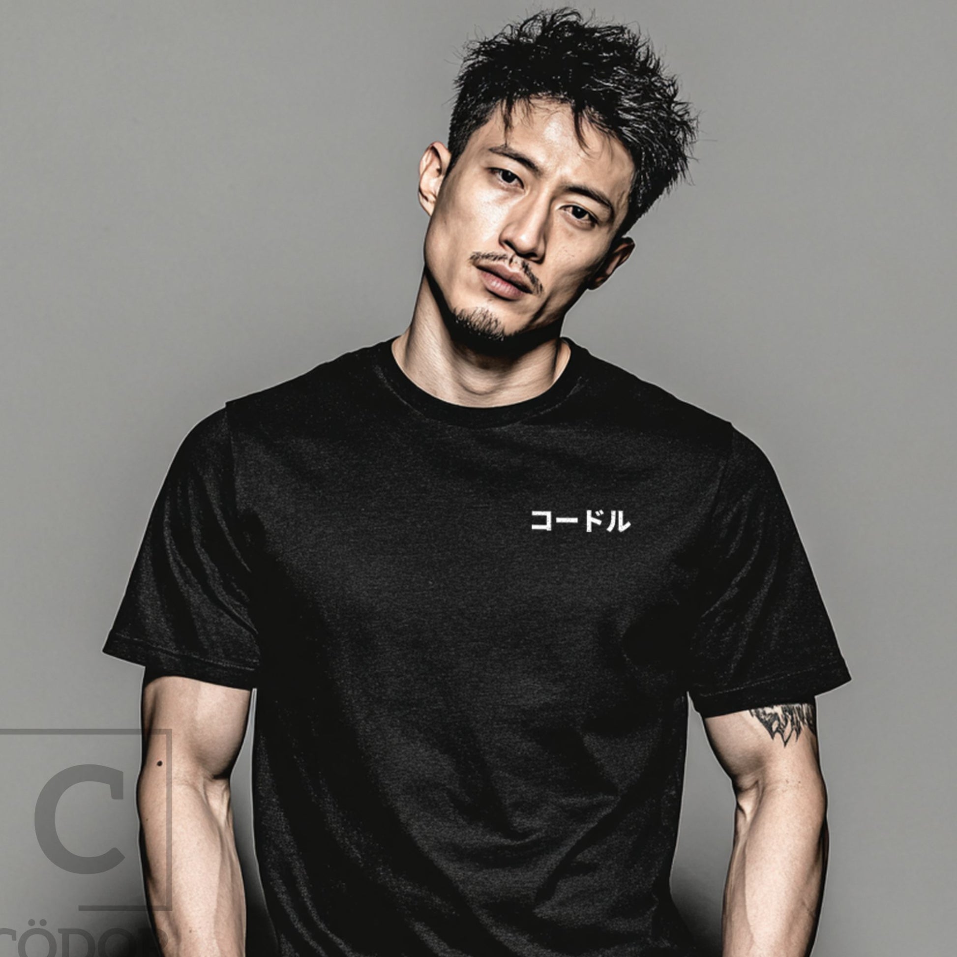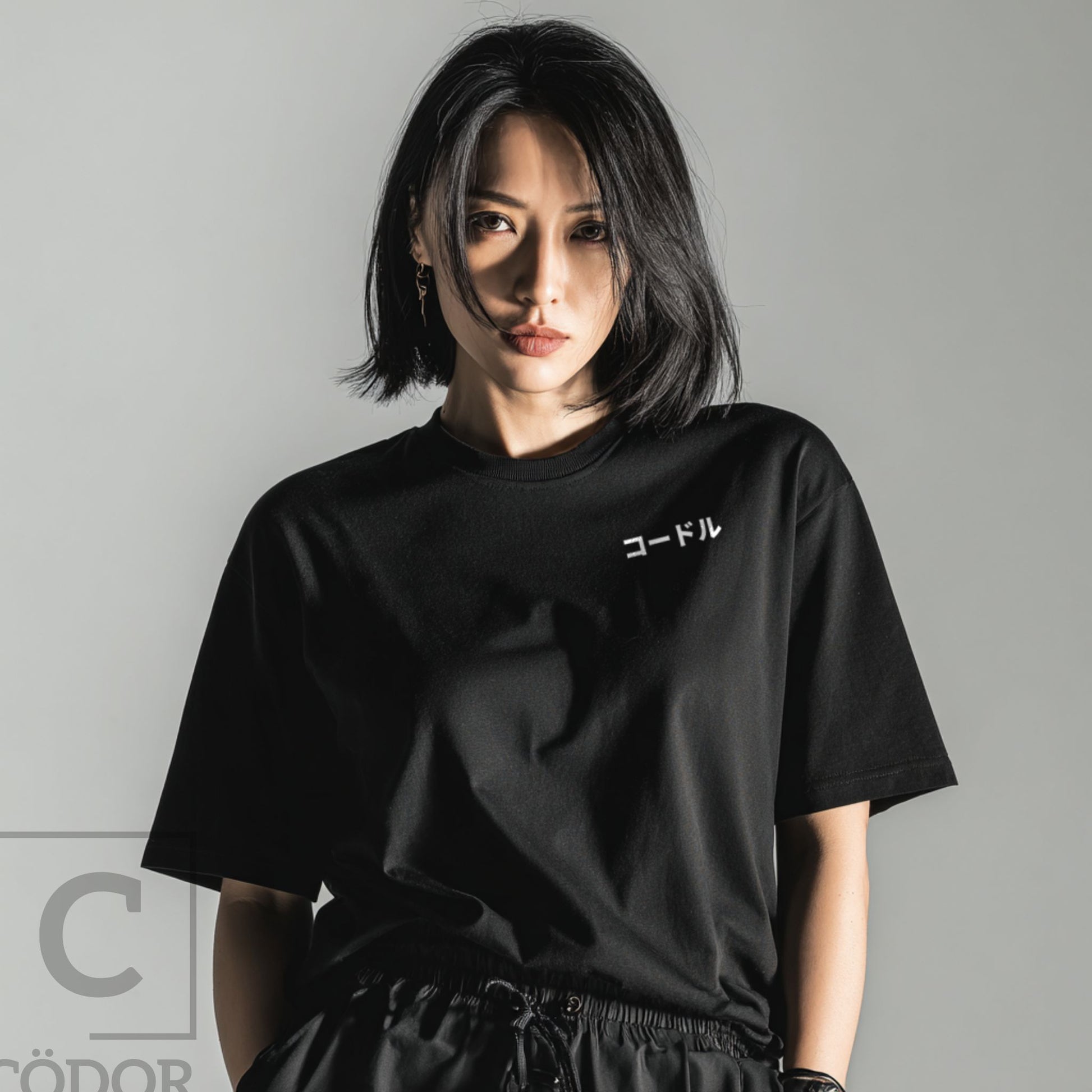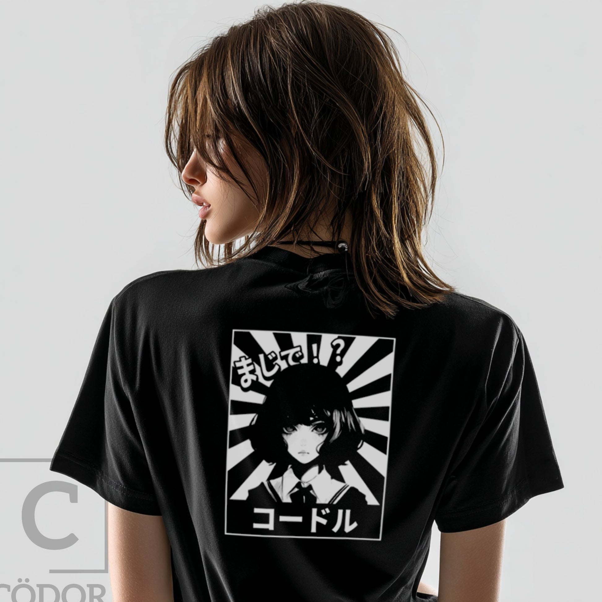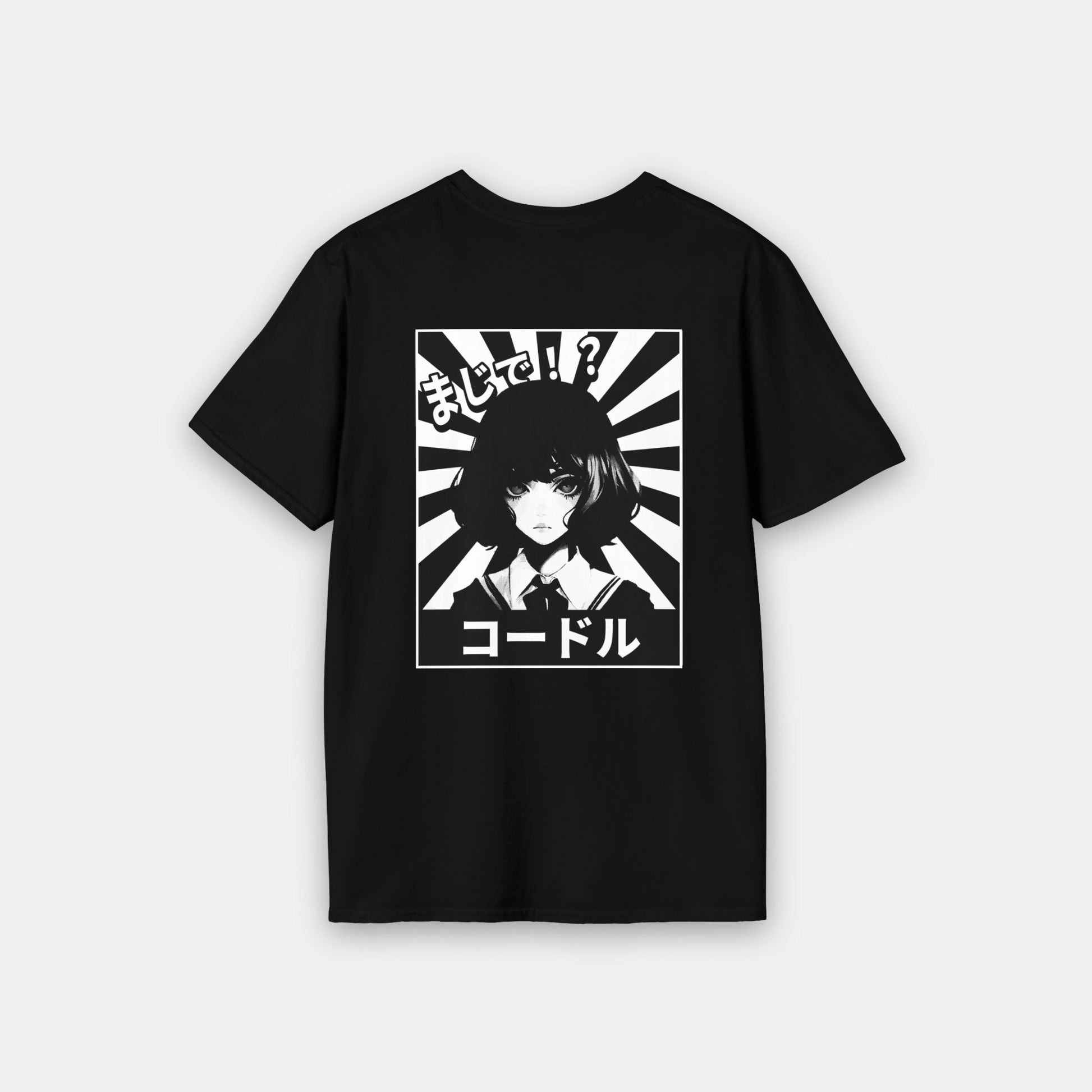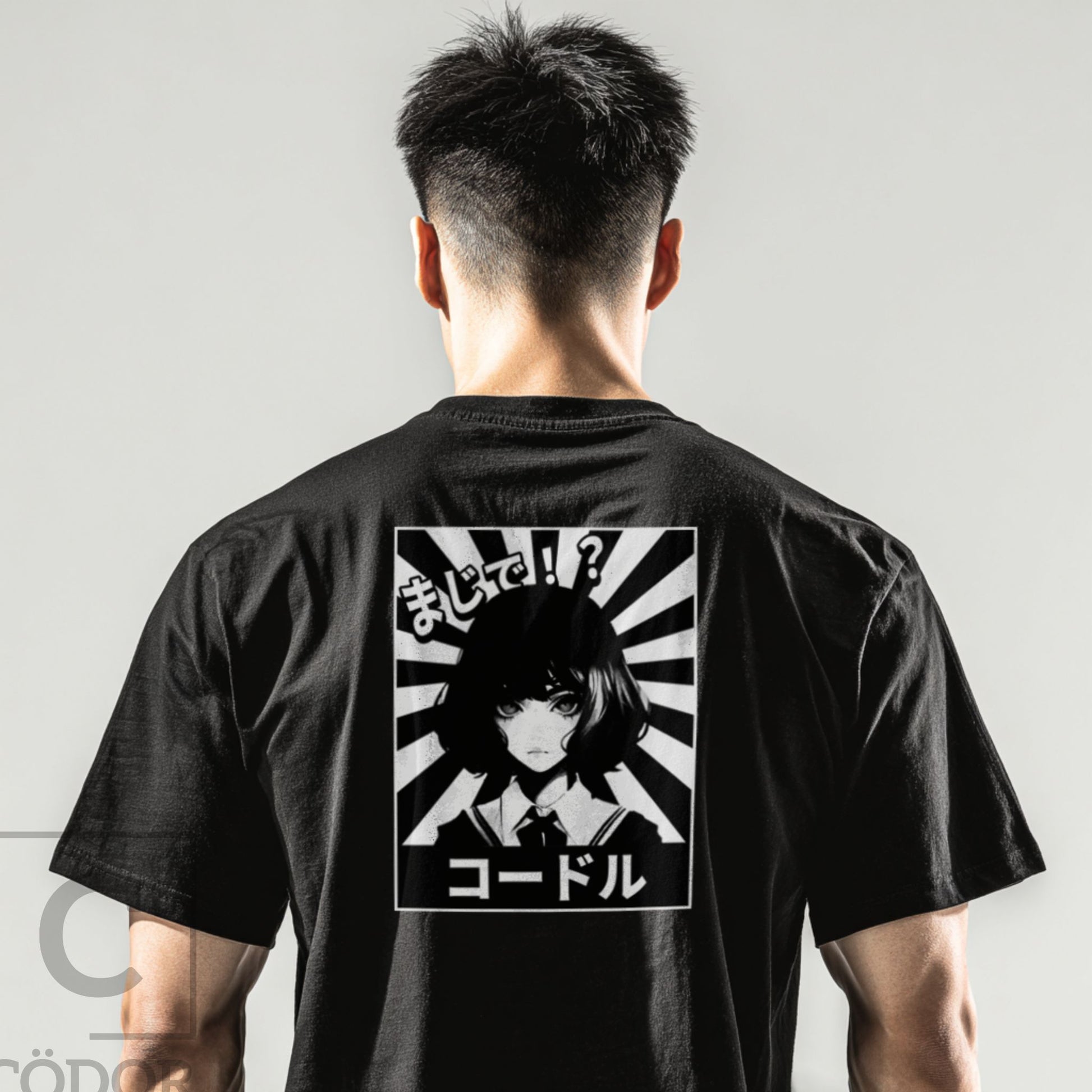 KÖDORU features a bold back print inspired by Japanese manga aesthetics, framed by sharp rising-sun lines and anchored by the Cödor name in katakana. The front remains intentionally minimal, finished with a subtle chest print for balance.